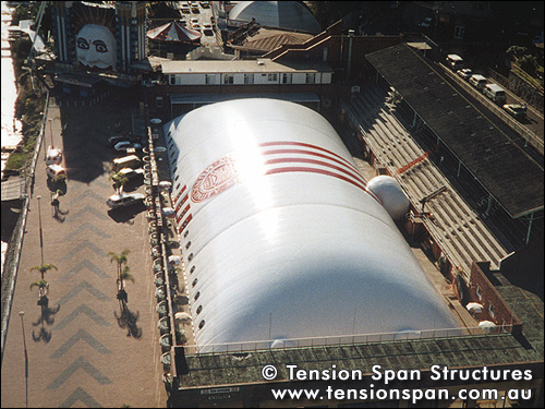 North Sydney Olympic Pool installed a new air inflated removable enclosure in May 1987. The curved red and white membrane provides winter protection for the 50 metre Olympic Pool, Toddlers Pool and is removable for the summer.