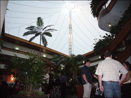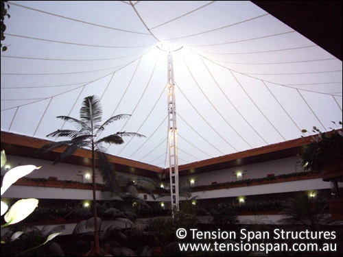 Over 1000sq.m of translucent tensioned membrane was installed by Tension Span to re-invigorate this attractive space. While it allows the light to shine through, it prevents UV rays from burning sensitive skin. The light level is ideal for the growth and health of the greenery while providing the perfect ambience for patrons.