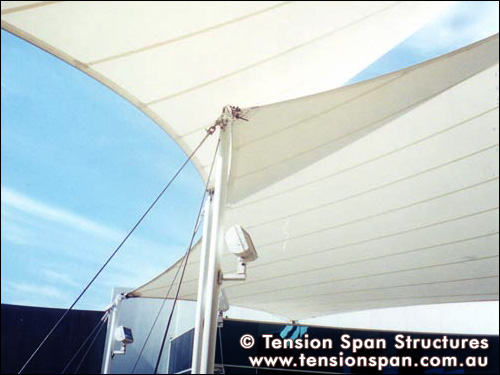 The wall attachment is a series of short SS Cables connecting to a catenary edge to both membranes. The overlap was designed to add an element of weather proofing and play of light and shade.